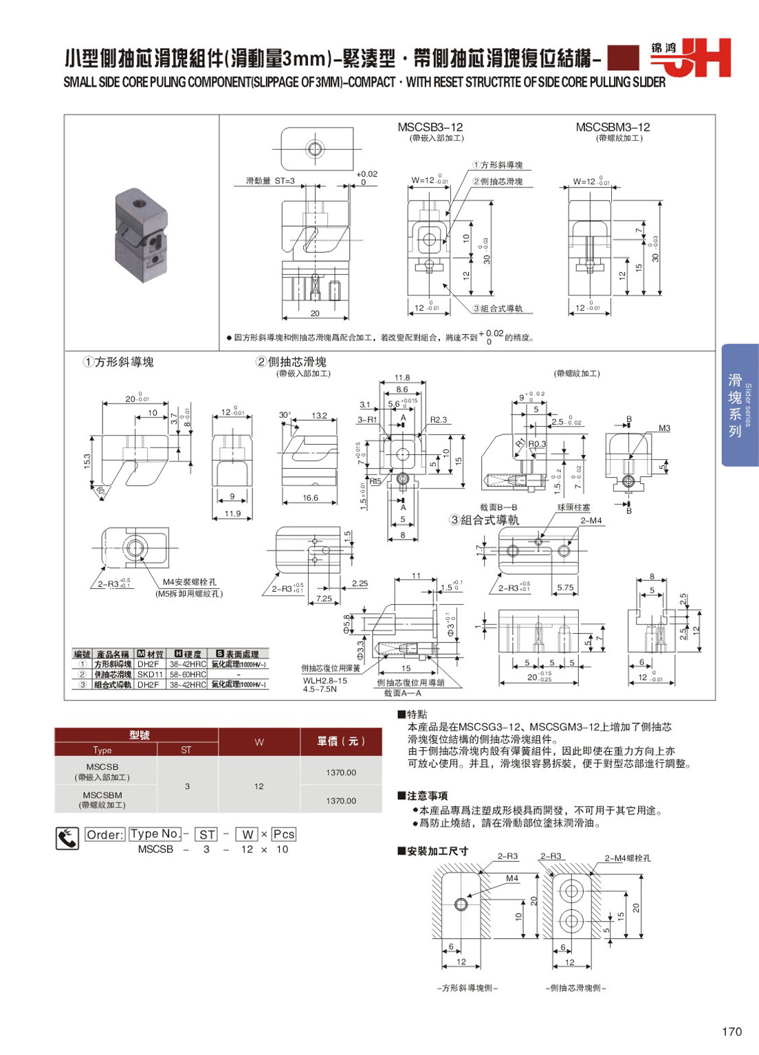 訂購:170-小型側抽芯滑塊組件(滑動量3mm)-緊湊型˙帶側抽芯滑塊復位結構 MSCSB