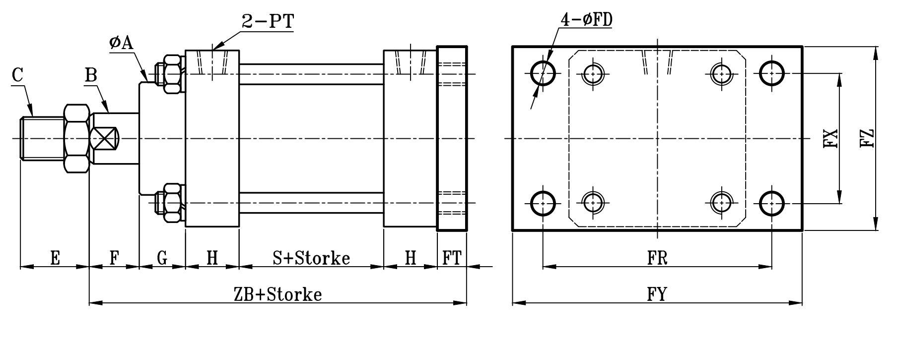 | 缸徑 BORE | ΦA | ΦB | C | E | F | G | H | PT | S | ZB | ZD | ΦFD | FT | FR | FX | FY | FZ |