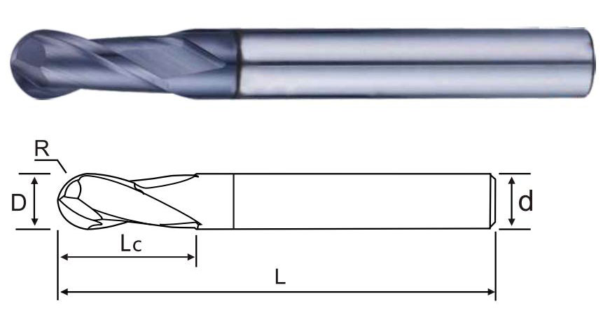 | 商品編號 Product number | 半徑(R) Radius of R | 刃徑(D) Blade diameter | 刃長(Lc) Blade length | 柄徑(d) Shank diameter | 全長(L) Overall length | 刃數 Flute |